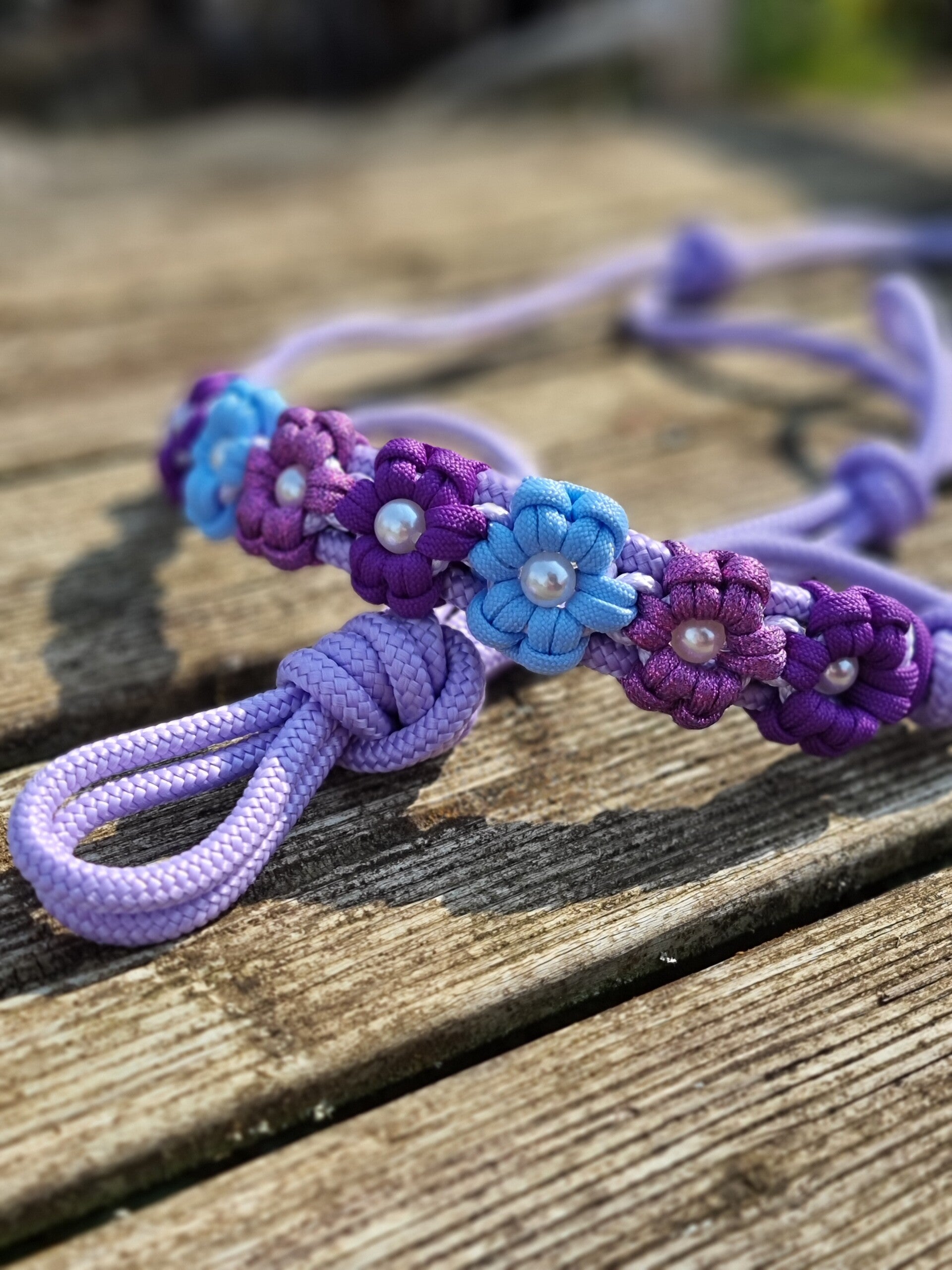 Laissez-vous séduire par notre licol en corde au tressage floral, une création tout en douceur pensée pour sublimer votre cheval avec délicatesse. Entièrement réalisé à la main, chaque licol dévoile un motif floral finement travaillé, rehaussé de petites perles discrètes qui captent la lumière avec subtilité.
