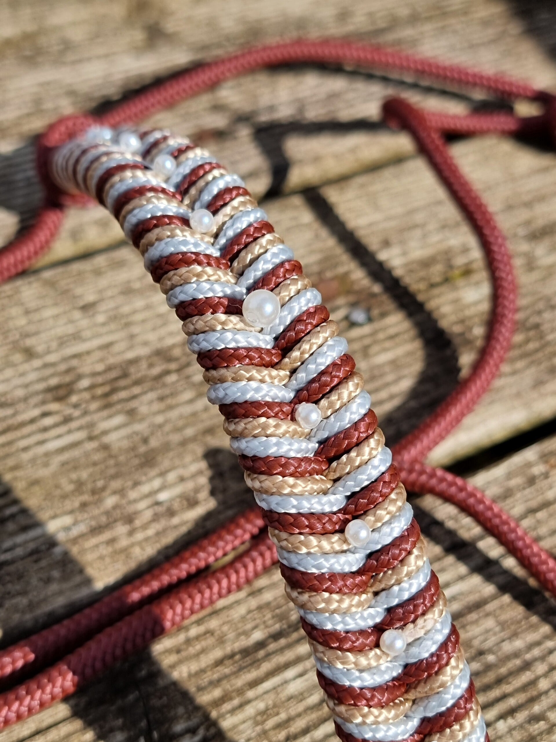 Laissez-vous séduire par notre licol en corde au tressage délicat, une création unique pensée pour sublimer votre cheval avec douceur. Entièrement réalisé à la main, chaque licol dévoile un motif finement travaillé, rehaussé de petites perles discrètes qui captent la lumière avec subtilité.